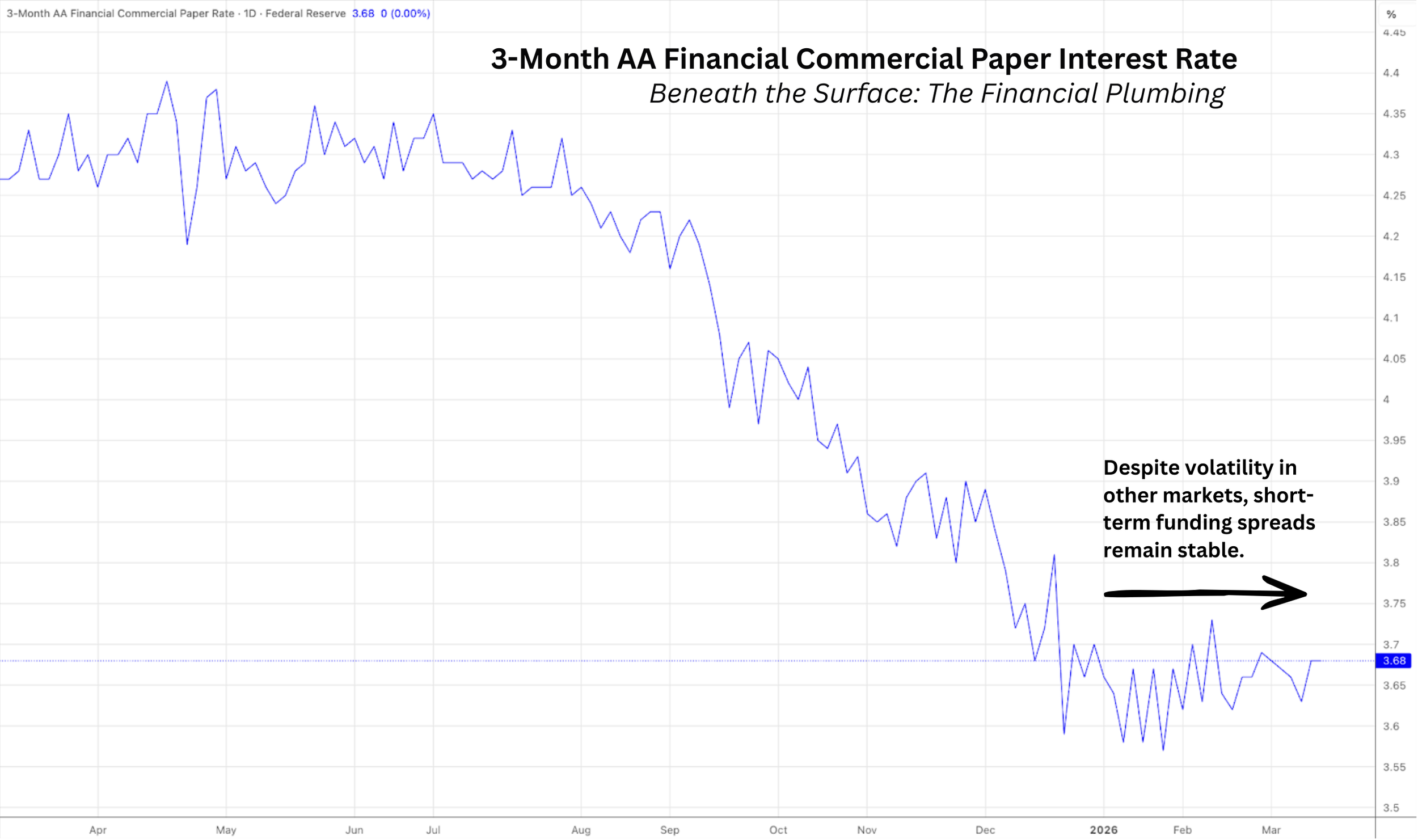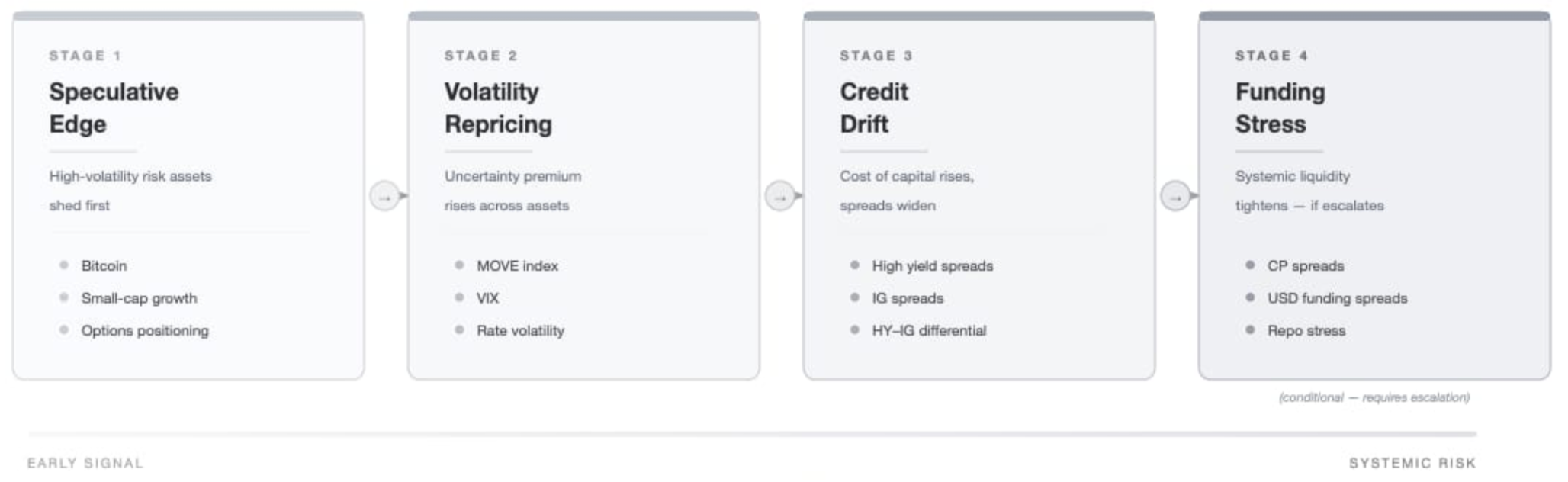 So far, financial plumbing is holding. Credit is stable. Equity breadth is steady. There are no clear signs of broad disorder. But markets are demanding greater compensation for uncertainty. That distinction matters.