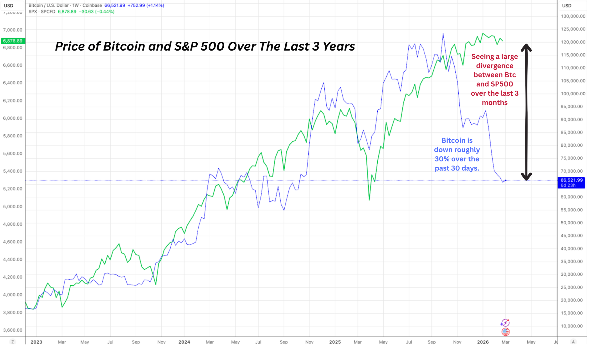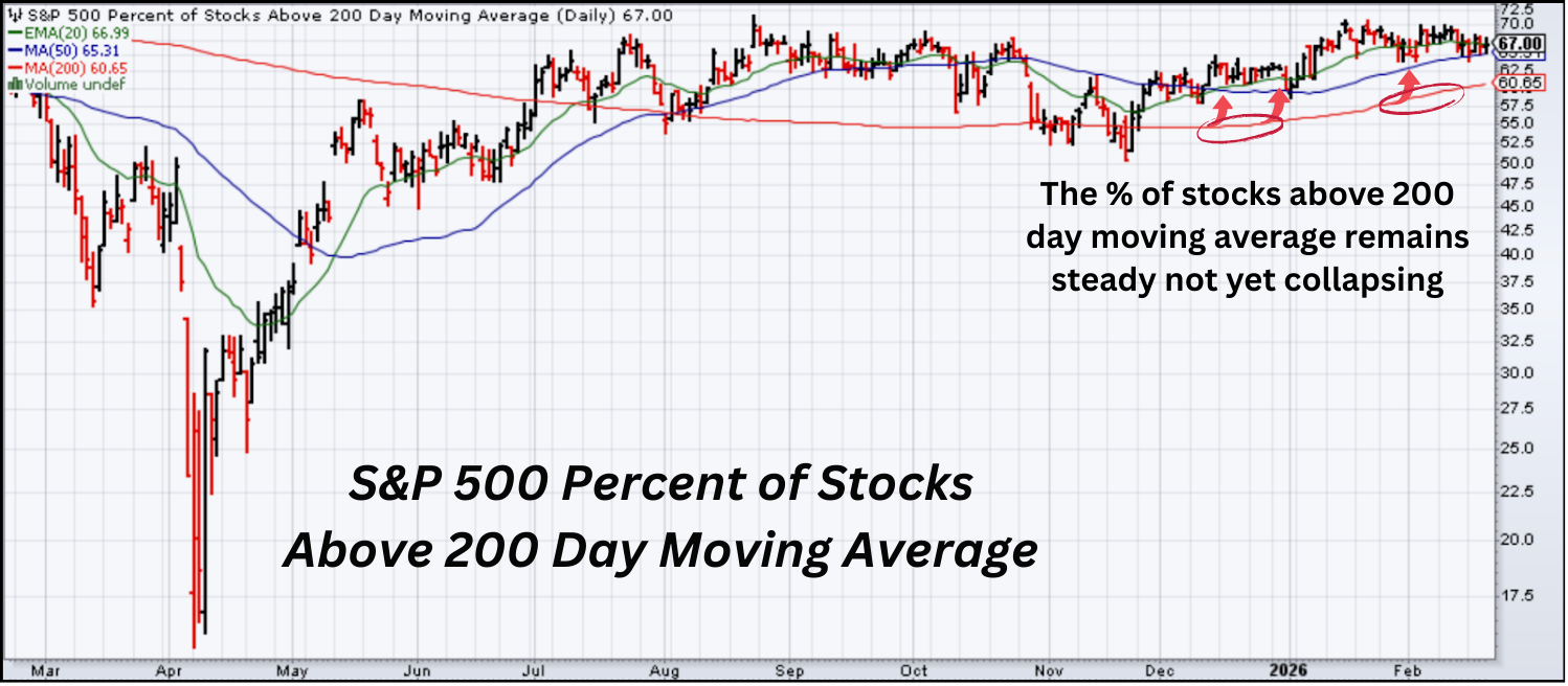Bitcoin has declined roughly 23% over the past 30 days and remains near recent lows. Meanwhile, the S&P 500 index itself is largely unchanged over the same period. The percentage of S&P 500 stocks trading above their 200-day moving average currently sits near 67% - roughly where it stood a month ago.