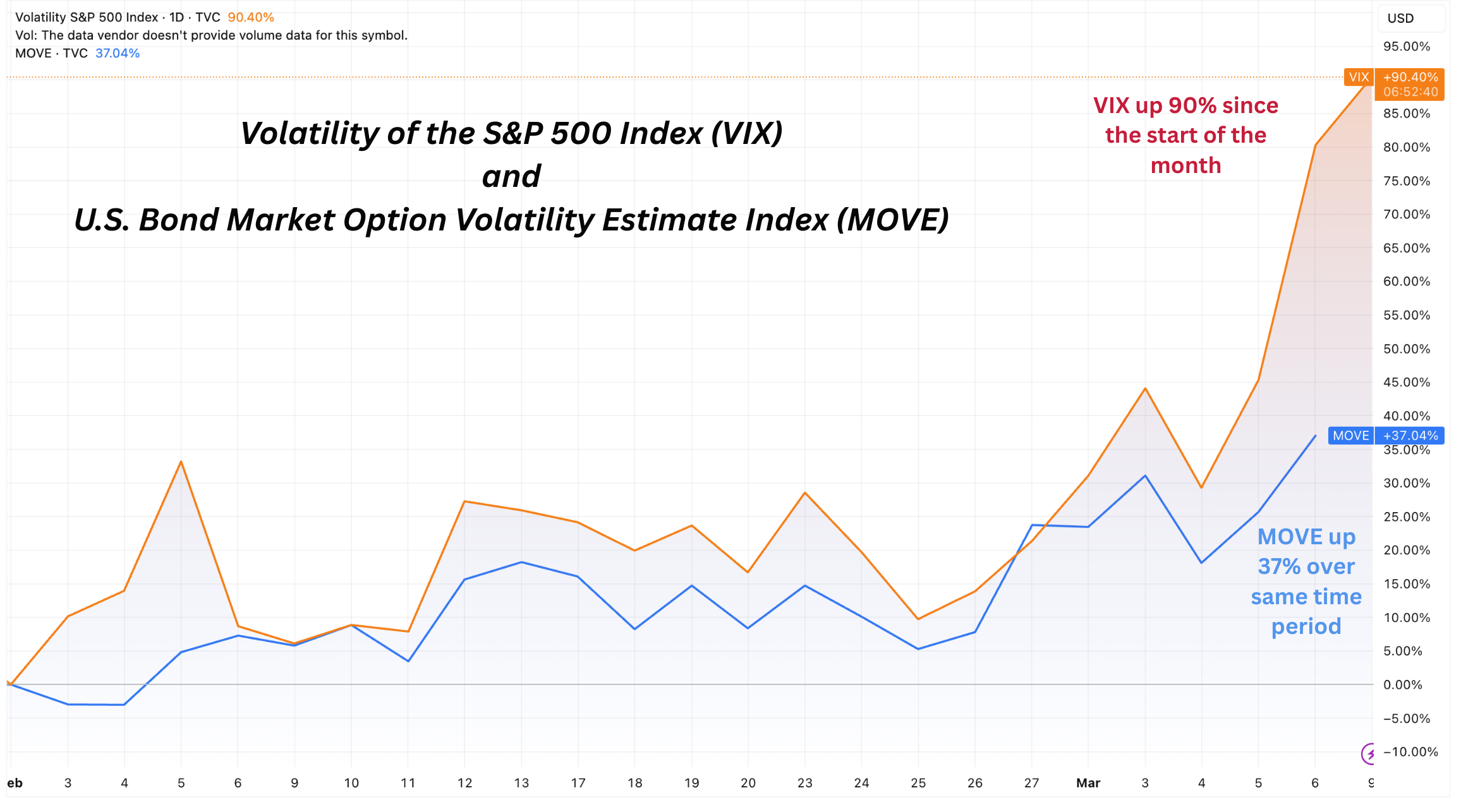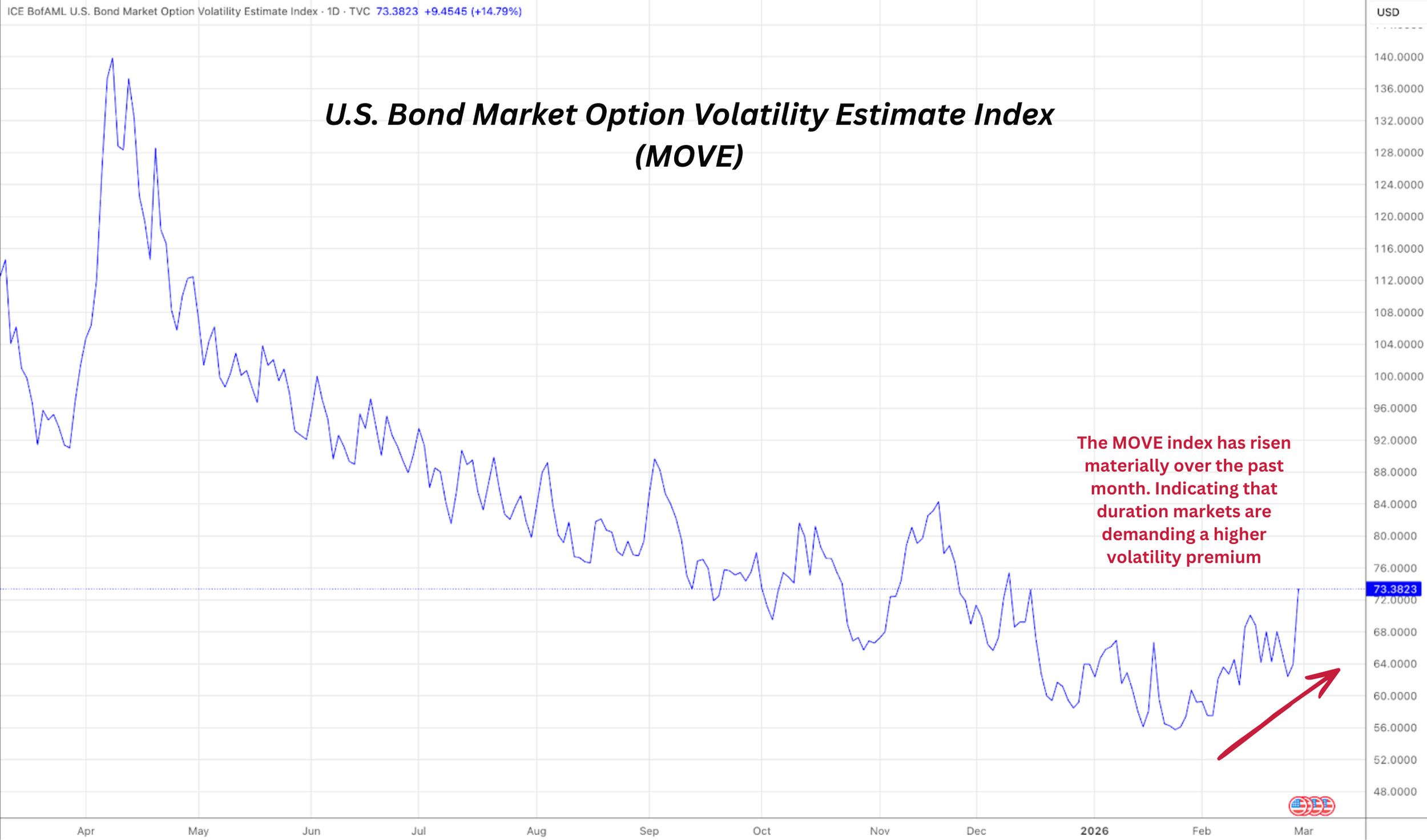 The MOVE index, a measure of bond market volatility, has risen over the past month. At the same time, the 10-year Treasury yield has fallen by approximately 16 basis points.