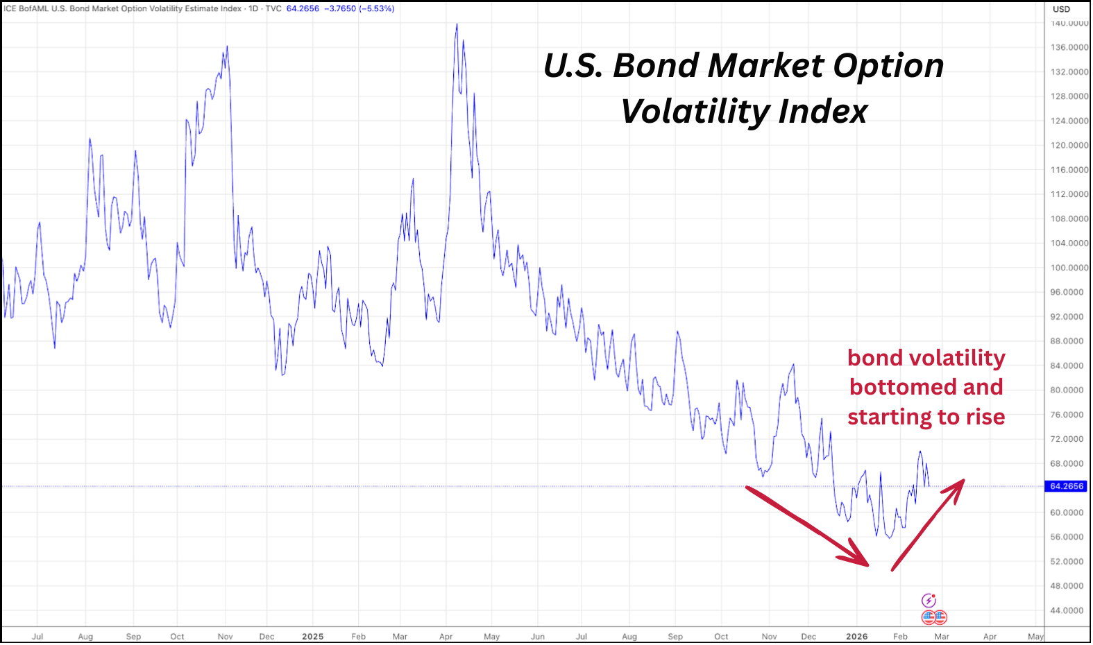 When yields fall but volatility rises, it suggests markets are repositioning while remaining unsure about the stability of the forward trajectory.