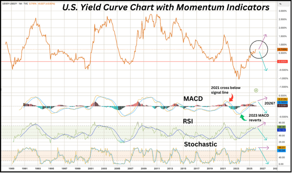 Recent rate behavior suggests U.S. credit conditions remain broadly stable, though momentum appears to be maturing. Yield-curve dynamics are approaching levels that historically warrant closer attention, particularly if they begin to roll over in a sustained way. A meaningful downturn would likely signal renewed recessionary pressure and accelerate deleveraging forces.