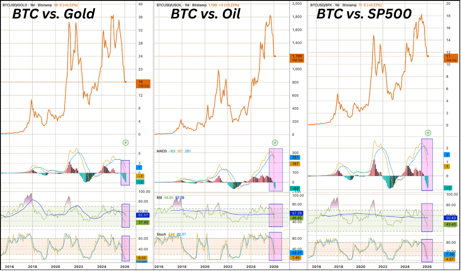 Relative comparisons show Bitcoin has retraced meaningfully against gold and equities, while remaining less compressed versus oil. This asymmetry implies that either Bitcoin weakens further relative to energy, or energy prices rise to rebalance the relationship — or some combination of both.