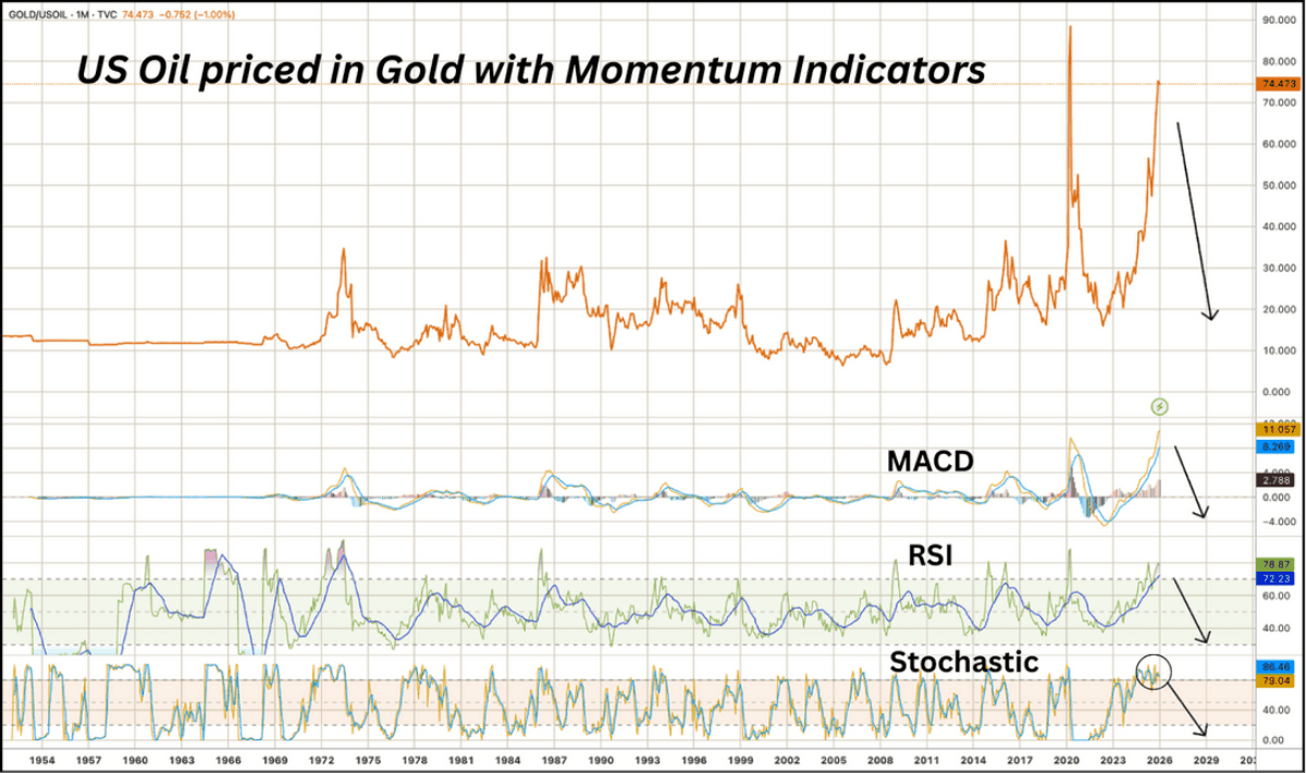 When measured against gold rather than USD, oil appears deeply compressed. Historically, during periods of macro stress and balance-sheet repair, energy tends to reassert itself as capital rotates away from financial leverage and toward scarce, productive inputs. These relationships rarely resolve through prolonged stagnation; instead, they tend to correct via repricing.